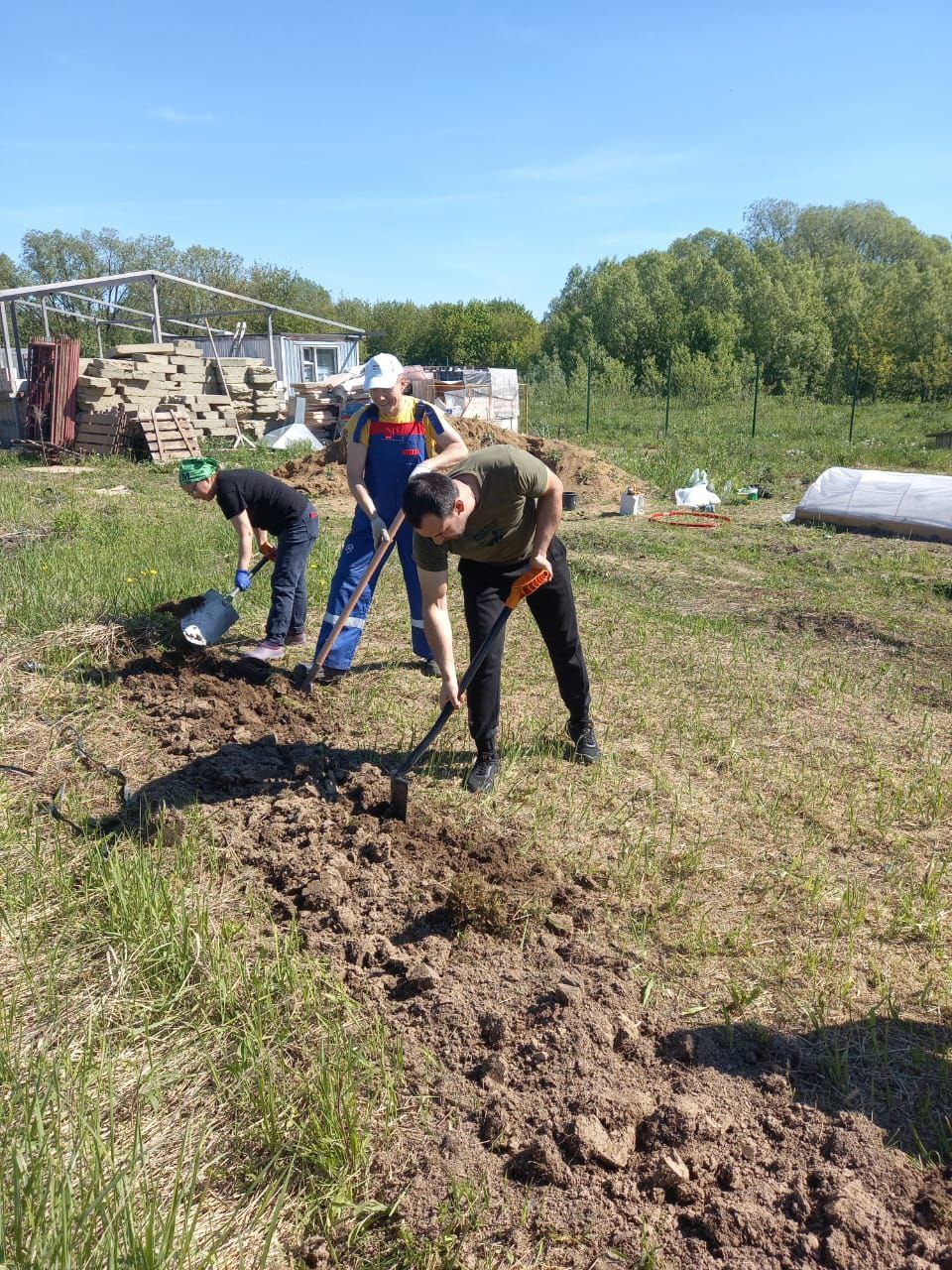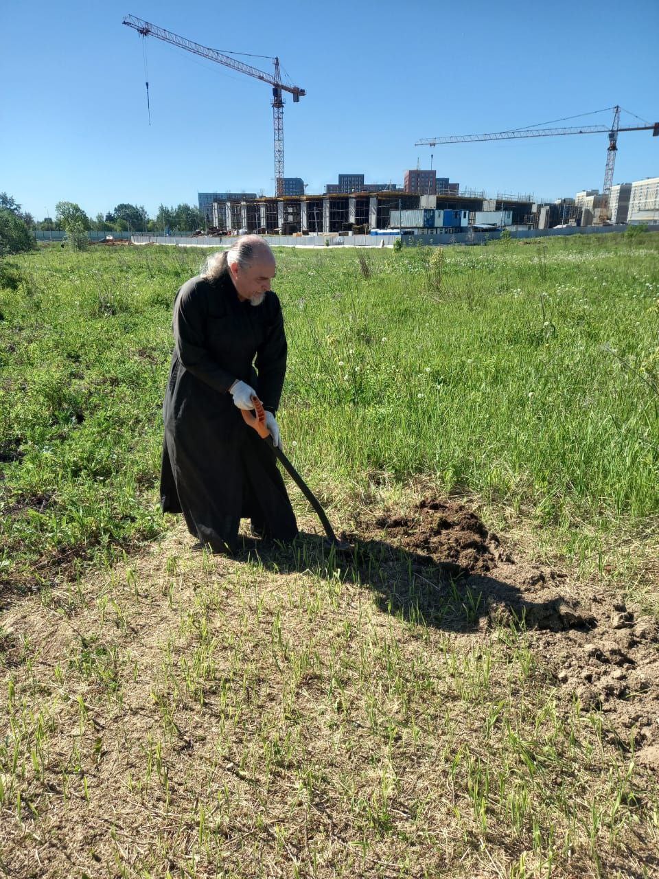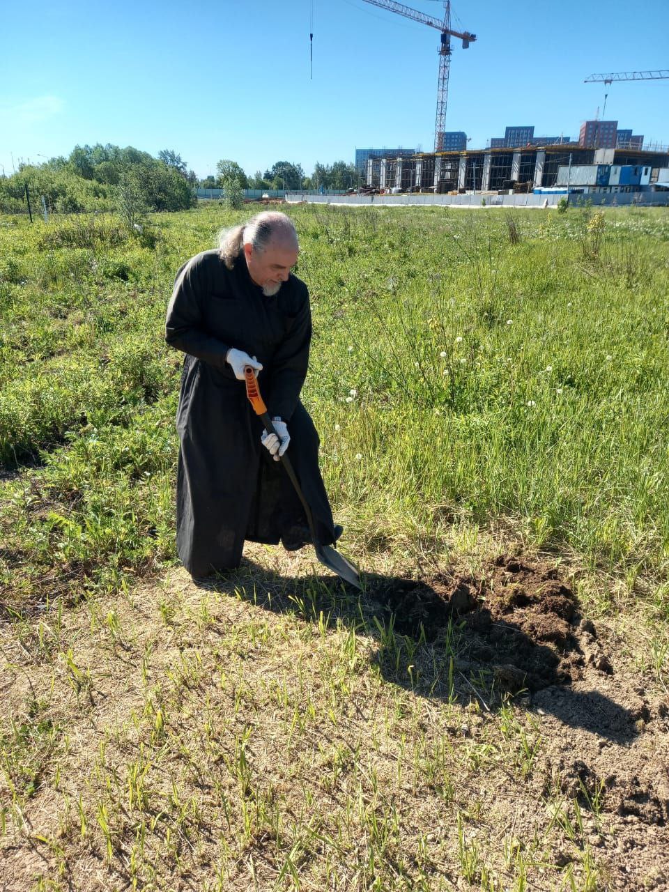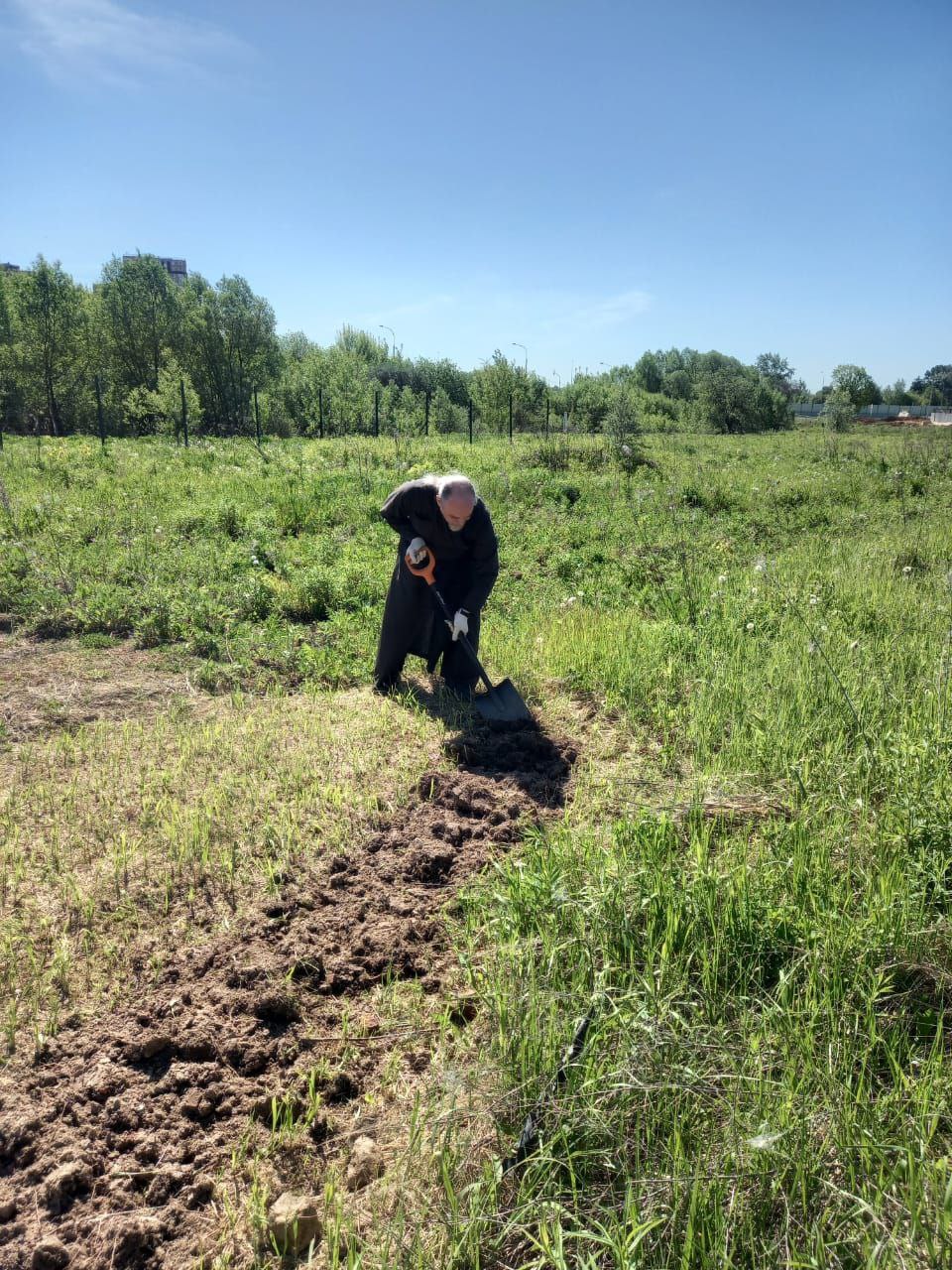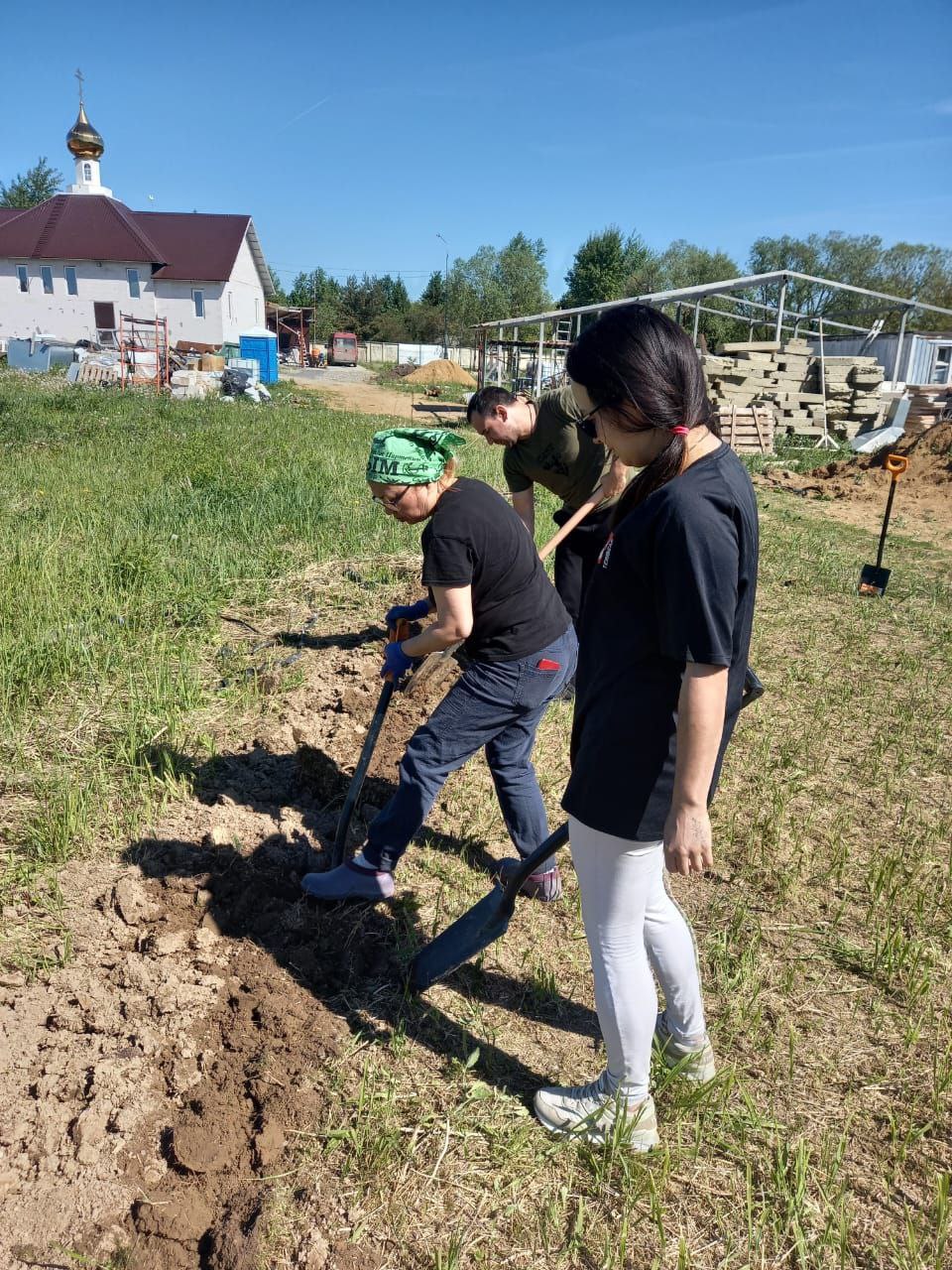 Сегодня утром, пока еще не жарко, вышли в поле сажать картошечку! Пока еще не началось основное строительство, места под грядки и огороды много! Прошлым летом мы так со своего поля и кормились! Все наши прихожане (и даже те, кто приходили впервые) знают, что в трапезной всегда их напоят чаем и накормят обедом.
