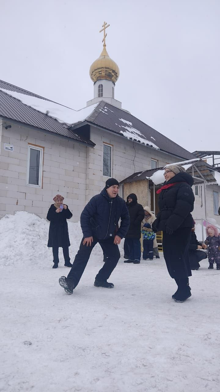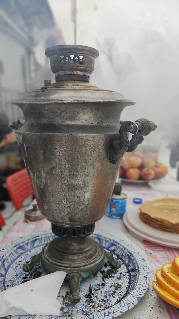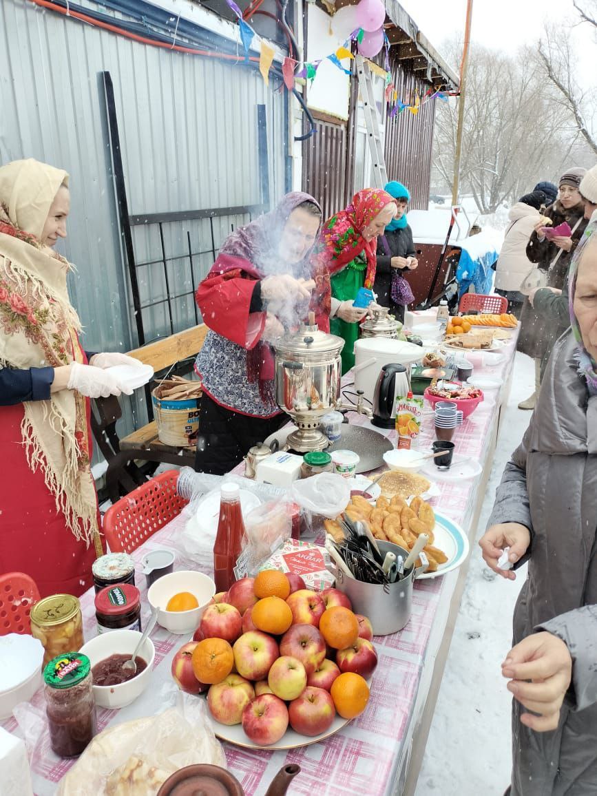 Приехало много народа, и это очень порадовало! Столы ломились от угощений: блины, пироги, овощные шашлыки, конфеты, чай, сбитень...!